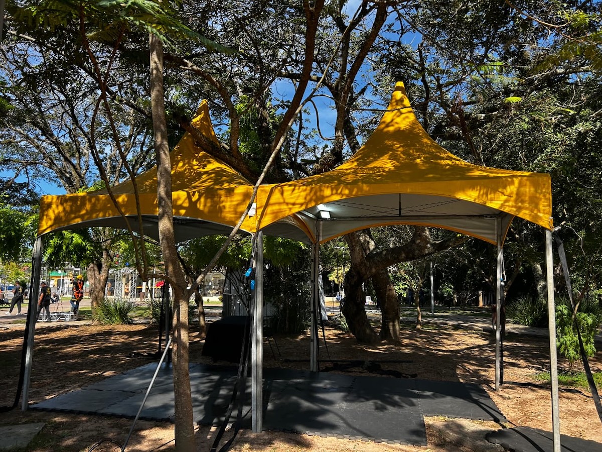 A lona de cobertura em PVC tensionado garante resistência à chuva, vento e radiação solar, mantendo o ambiente interno protegido e agradável.